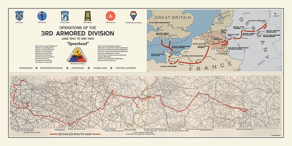 This campaign map shows the route of the 3rd Armored Division throughout Europe during World War II. This chart is available for purchase at HistoryShots.com.
