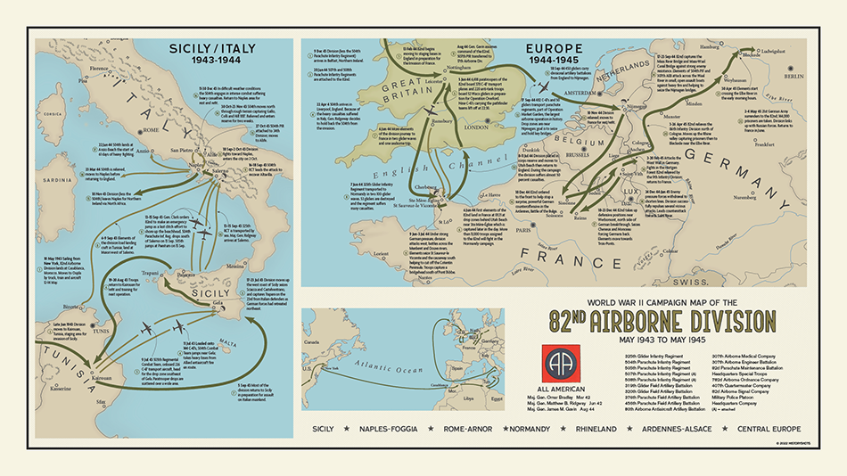 This campaign map shows the route of the 82nd Airborne Division during World War II. This chart is available for purchase at HistoryShots.com.